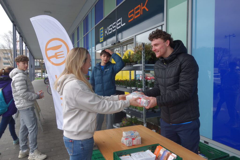 Ein Teil der Gruppe verteilte an die Kundschaft der Märkte Einkaufszettel mit den entsprechenden Empfehlungen, welche Lebensmittel die Tafel benötigt, weitere Jugendliche nahmen dann an ihrem Stand die Waren in Empfang.